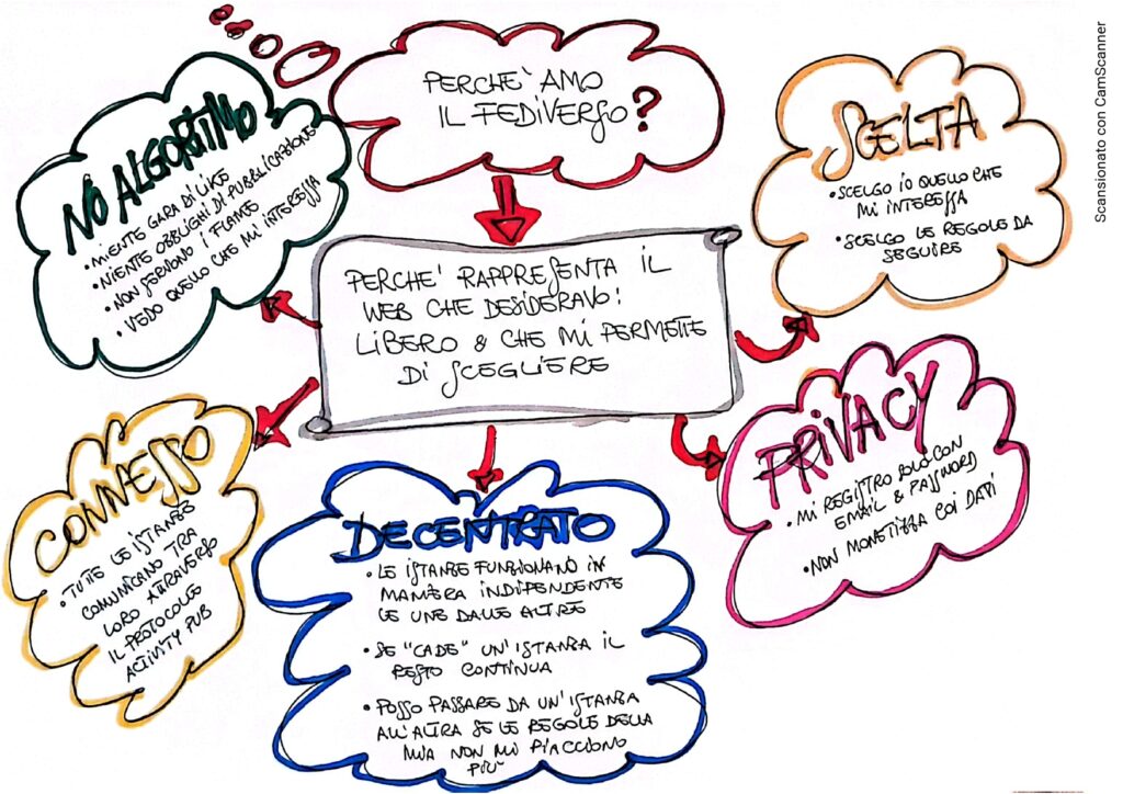 Amo il FEDIVERSO anche per altri motivi, ma quella su cui voglio qui soffermarmi è la sua caratteristica di decentramento. Abbiamo già visto che una app nel FEDIVERSO esiste su diverse “istanze” e questo ci mette al riparo da eventuali “colpi di mano” del padrone di turno. Se una istanza cambia regole o cambio io e le sue regole non mi piacciono più, posso continuare a stare su quella app usando un’altra istanza o creandomi una mia istanza personale (se lo so fare tecnicamente), SENZA PERDERE tutto quello che ho costruito e quindi, per esempio nei social: contatti, post, amicizie, configurazioni, etc…